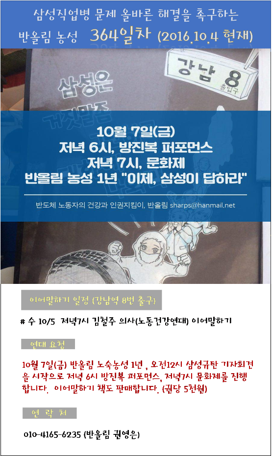오후6:00 삼성직업병문제 올바른 해결을 촉구하는 반올림 농성/이어말하기(노동건강연대 김철주 의사)/강남역 8번출구