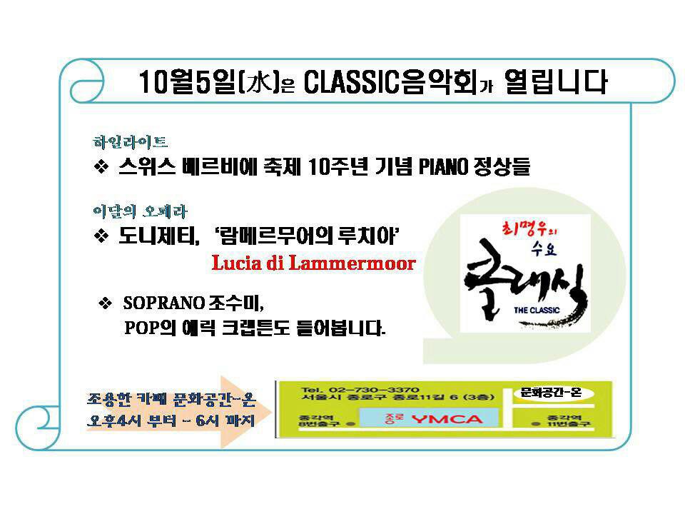 오후3:00~5:00 최명우와 함께 하는 수요클래식 감상회/문화공간온(종각역 8번출구 YMCA 우리은행 옆 골목)