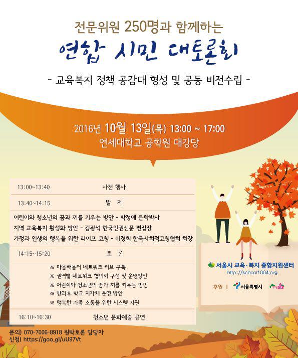 오후1:00~5:00 전문위원 250명과 함께하는 연합 시민 대토론회/교육복지 정책 공감대 형성 및 공동비젼 수립/연세대 공학원 대강당