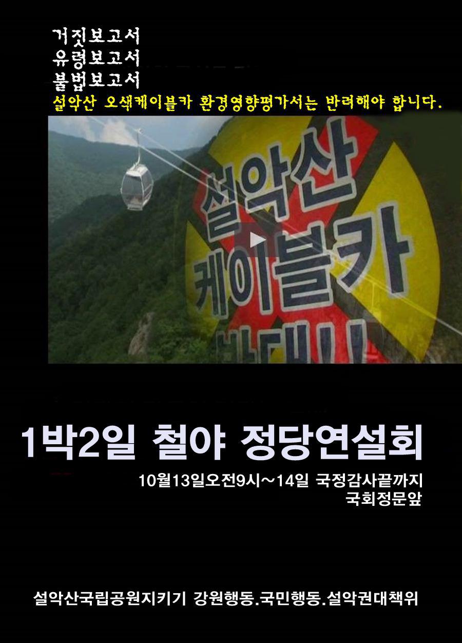 *12일 09시 ~ 13일(금) 국정감사 종료 시 (1박 2일)/설악산 오색케이블카 환경영향평가서 반려를 위한 1박2일 정당연설회(노동당.정의당.녹색당)/국회 정문 앞