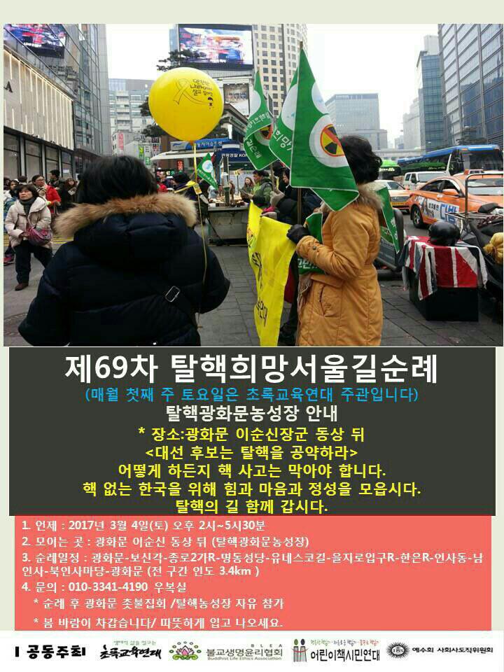 오후2:00~5:00 제29차 탈핵희망 서울길 순례/광화문광장 해치마당~보신각~명동성당~을지로입구역~북인사마당