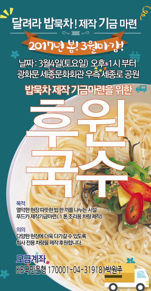 오후1;00 밥묵차 제작기금 마련을 위한 후원국수/세종문화회관 우측 세종로공원