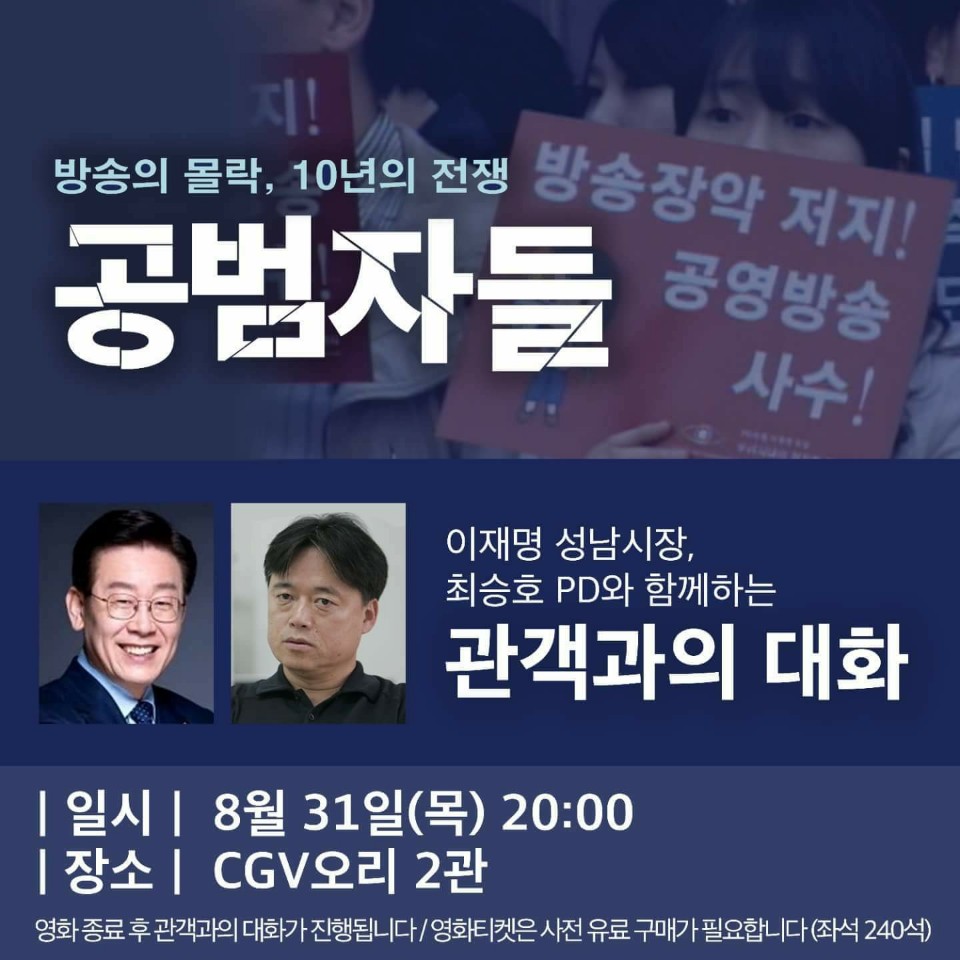 오후8:00 <공범자들>이재명 성남시장과 최승호PD와 함께하는 관객과의 대화/CGV오리2관