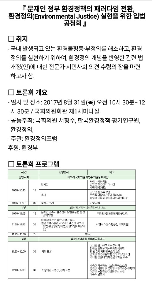 10:30 환경정의연구소/ 문재인 정부의 환경정책 패러다임 전환과 환경정의 실현을 위한 입법 공청회/ 국회의원회관 제1세미나실