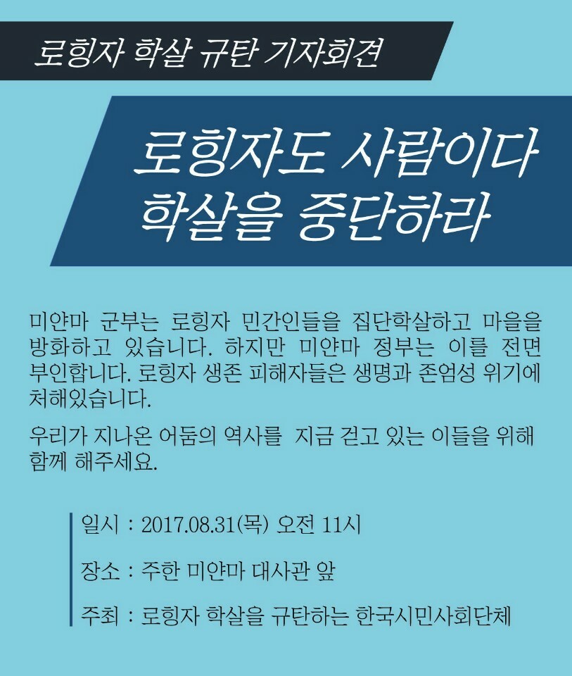 11:00 로힝자 학살규탄 한국 시민사회단체/ 미얀마 로힝자 학살을 규탄하는 한국시민사회단체 기자회견/주한 미얀마 대사관 앞