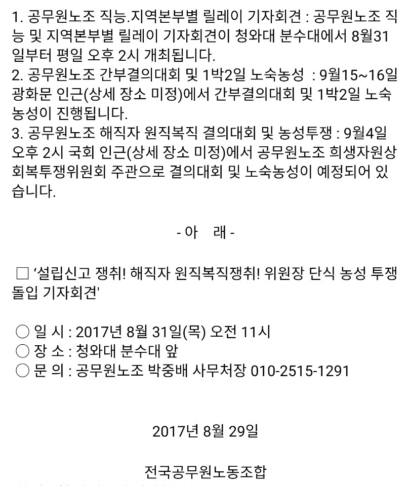 11:00 전공노/ 단식농성 돌입 기자회견/ 청와대 분수대 앞