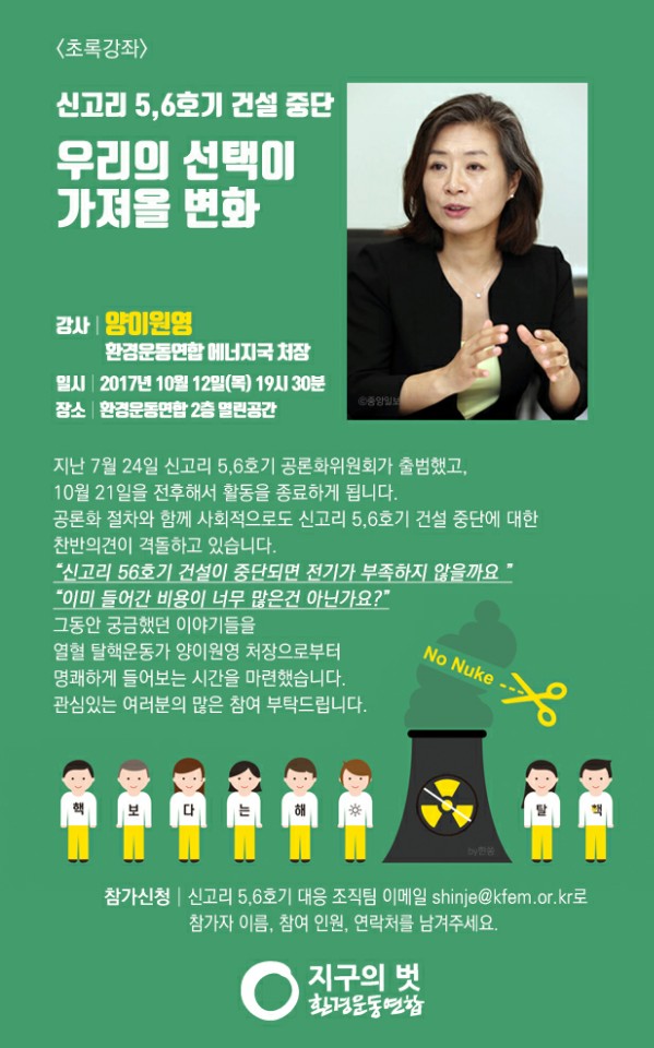 오후7:30 환경운동연합 초록강좌/신고리 5,76호기 건설 중단 '우리의 선택이 가져올 변화(양이원영 처장)/환경운동연합 2층 열린공간