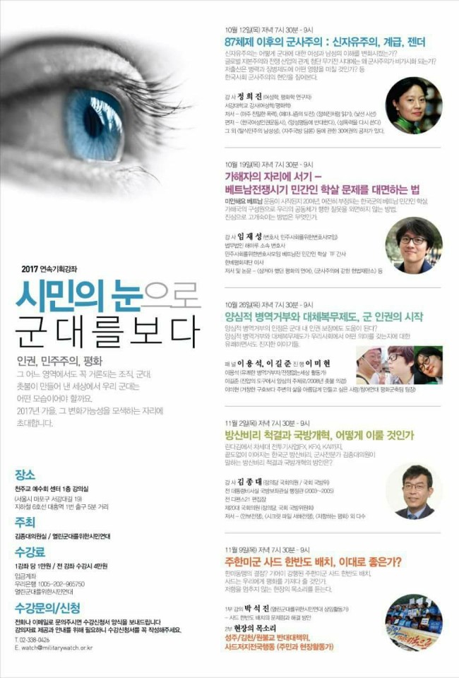 오후7:00 열린군대를위한시민연대 연속기획강좌/시민의 눈으로 군대를 보다/87체제 이후의 군사주의.신자유주의.계급.젠더/천주교 예수회 센터 1층 강의실
