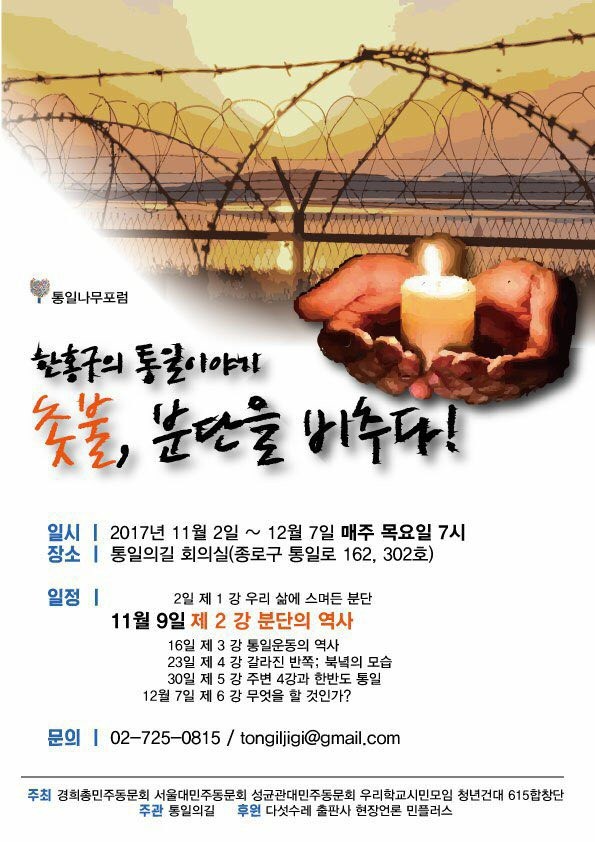 오후7:00 통일나무포럼 연속 기획강연/한홍구의 통일이야기 '촛불, 분단을 비추다!'/제3강 통일운동의 역사/통일의길 회의실