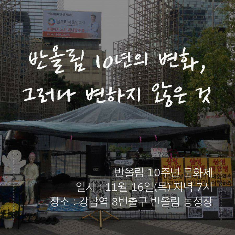 오후7:30 반올림 10주년 촛불문화제, 강남역 8번출구 반올림농성장 앞