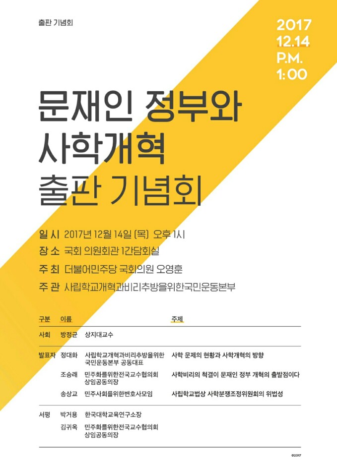 오후1:00 문재인 정부와 사학개혁 출판기념회/국회의원회관 1간담회실