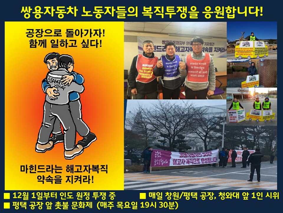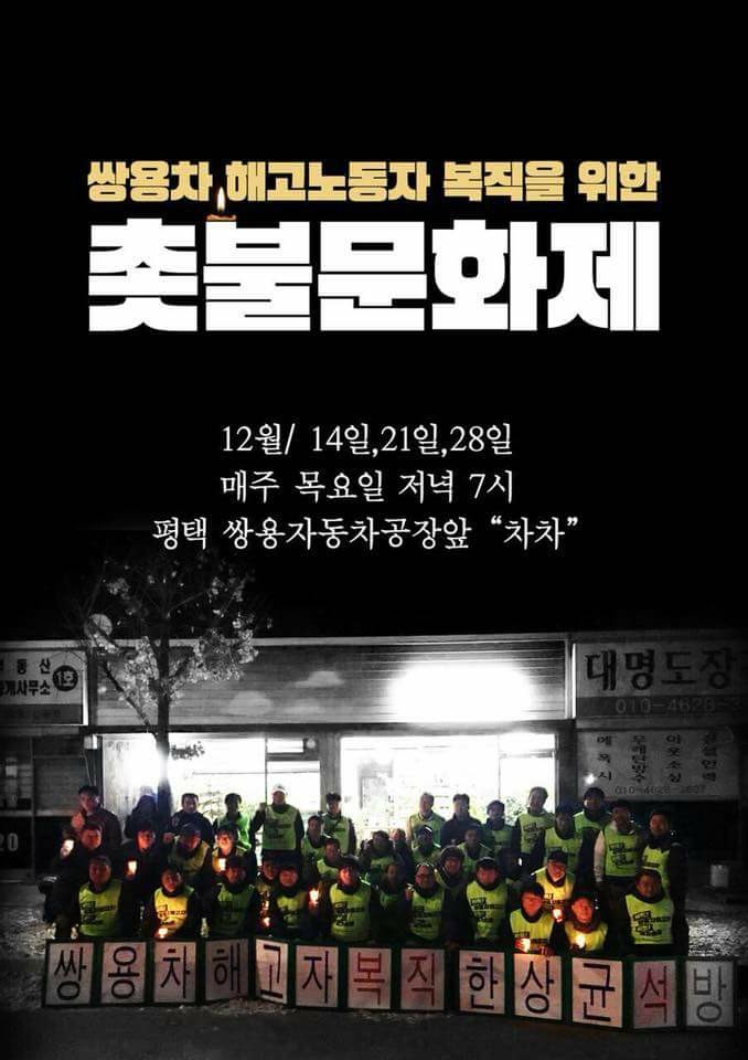 오후7:30 쌍용자동차 노동자들의 복직투쟁/인도 마힌드라 원정투쟁/매주 목요일 촛불문화제/평택 공장 앞