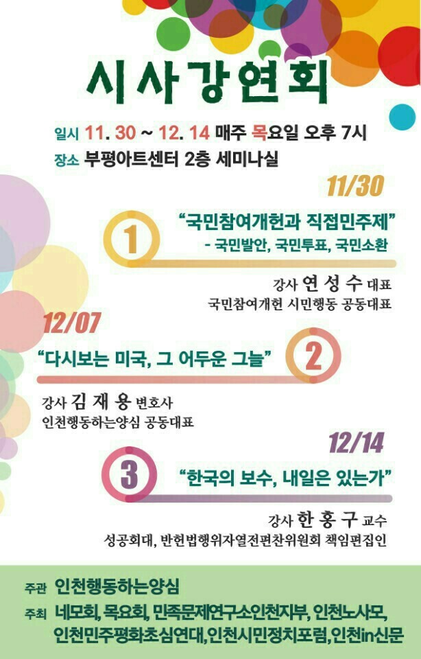오후7:00 인천행동하는양심 시사강연회/“한국의 보수,내일은 있는가”(한홍구교수)/부평아트센터 2층 세미나실