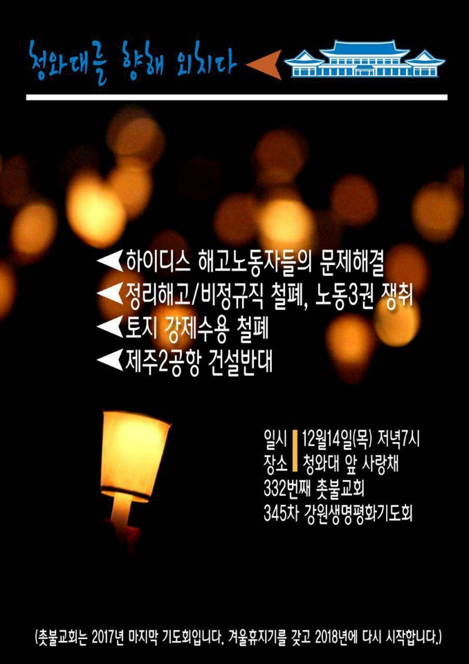 오후7:00 촛불교회.강원생명평화기도회/하이디스 해고노동자 문제해결.비정규직 철폐.노동3권 쟁취.토지 강제수용철폐.제주2공항 건설반대/청와대 앞 사랑채