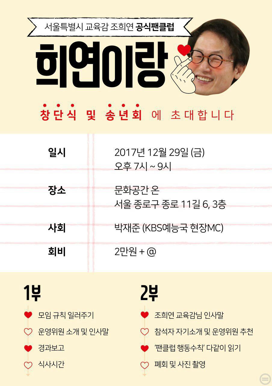 오후7:00 조희연 교육감 팬클럽 ‘희연이랑’ 창단식 및 송년회/문화공간온 (종각역 11번출구 YMCA 우리은행 옆)