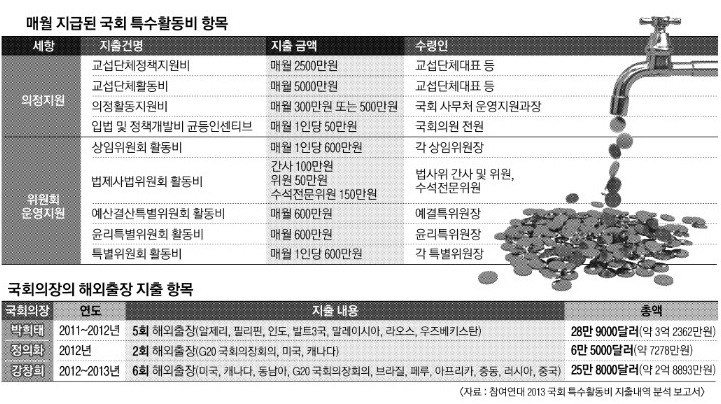 홍준표 전 자유한국당 이외의 다른 국회의원들은 이 돈을 제대로 목적에 맞게 지출하고 정산했을까? 참여연대가 정보공개청구로 밝히 자료에 따르면 교섭단체대표는 실제 특수활동을 수행했는지와 무관하게 매월 6,000여만원을 수령했고, 상임위원장이나 특별위원장도 위원회 활동과 관계없이 매월 600만원씩 지급받았다. 2011년 1월, 국회의장의 해외순방 때는 의장 앞으로 특활비 6만 4000달러, 약 7280만 원. 2013년 3월, 여야 의원 4명, 국제의원연맹 회의 참석을 위한 남미출장에 1억 1770만 원(의원 1명당 1000달러의 용돈). 2013년 3월, 의장의 남미 방문 때 4만 5000달러(약 5000만 원)....을 받아 사용했다.